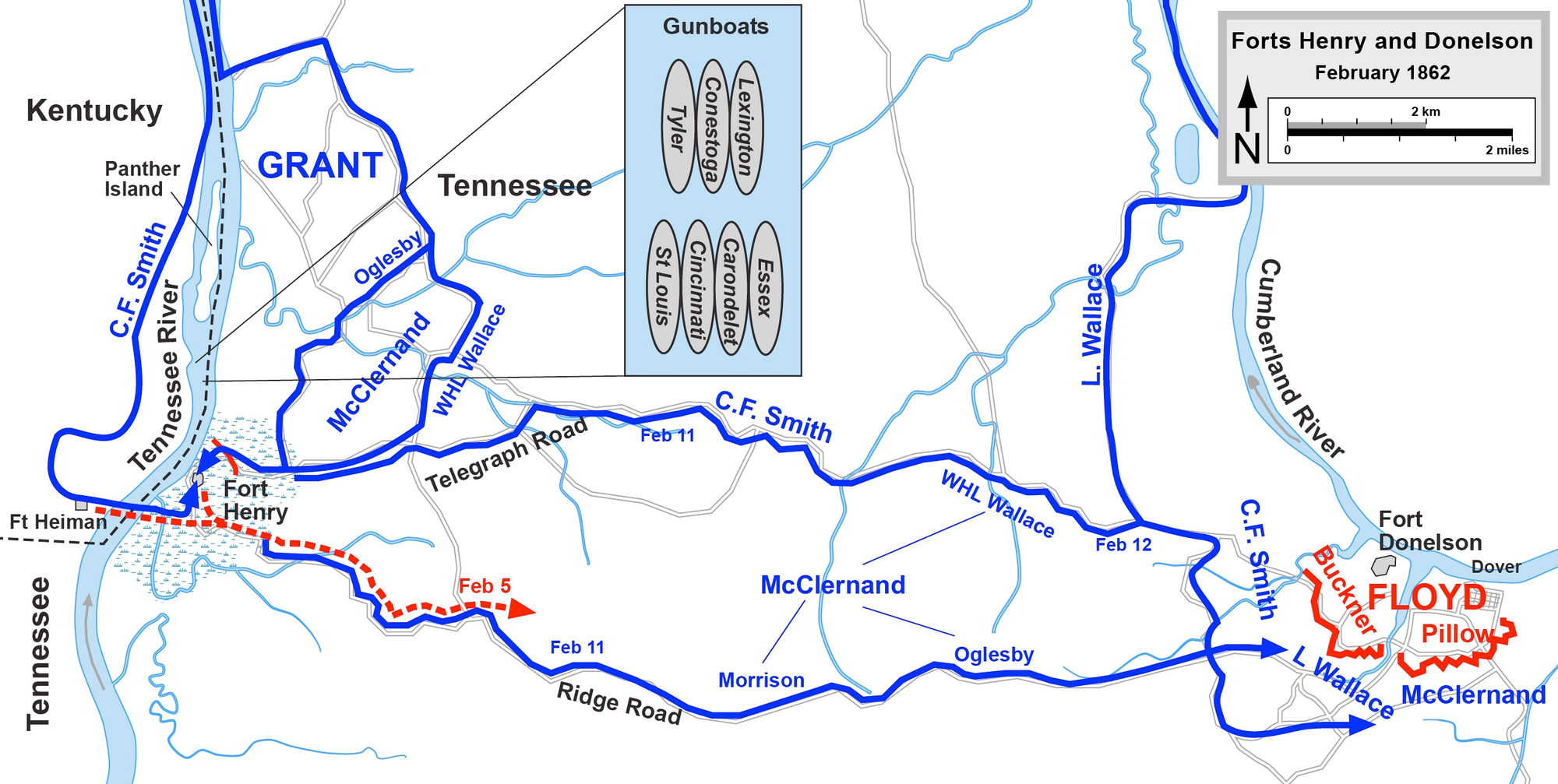 In May 1861, just a month after the Confederate attack on Fort Sumter, Brigadier General Donelson led a surveying team along the Cumberland and Tennessee rivers and selected dual sites to build supporting forts, one on the eastern bank of the Tennessee River, the other other on the western bank of the Cumberland River at the point where the two rivers are separated by just a few miles in northwest Tennessee.