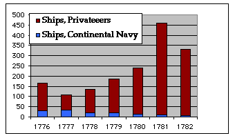 The rest of the force was drawn from the large privateering fleet that had flourished as British trade became fair game. I've talked about privateering a few times in past episodes, but the way it essentially worked was the government gives private citizens the right to attack enemy shipping, subject to certain restrictions. This was distinguished from piracy (at least in the eyes of the people doing the privateering) because privateers could only attack the ships of certain countries their government authorized, abide by some basic rues of civility and not wantonly torture, rape, murder, or sell the crew of captured ships into slavery as pirates were and still are like to do, as well as split the value of the captured ship and cargo with the government which authorized the privateering in the first place. For the most part, privateering was a powerful tool in the Revolutionary War, and later in the the War of 1812 a well. It is a traditional weapon of weaker powers who cannot go toe-to-toe with stronger powers afloat against their stronger rivals. Privateering is a form of guerilla warfare at sea, and just like all forms of guirilla warfare is exponentially harder and more expensive to defend against than carry out. Privateering essentially mustered the entrepreneurial spirit of the rich to finance and arm the seafaring to go plunder the ships of a nation's enemies. This brought in money, badly needed supplies, and just as importantly, cost the enemy a lot of money in the form of lost ships and cargo, which in turn created a powerful lobbying force in the capital of the larger power for ending the war so everyone could go back to making money. The primary downside is that it did divert the finite seagoing resources of ships and sailors away from central, coordinated action and dispersed them to whatever ends the privateers found most profitable.